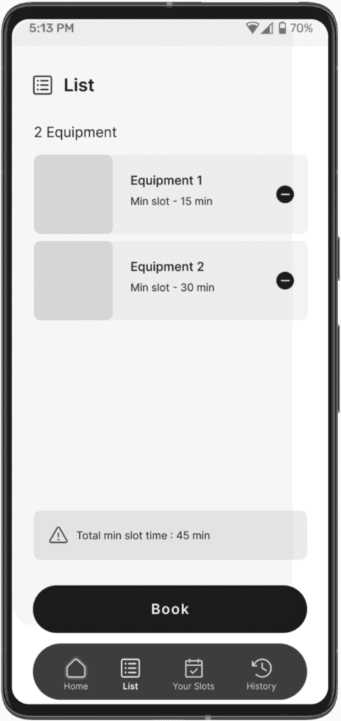 A complete crowd management system that allows students to view the status of equipment present in the lab, and book it if available.