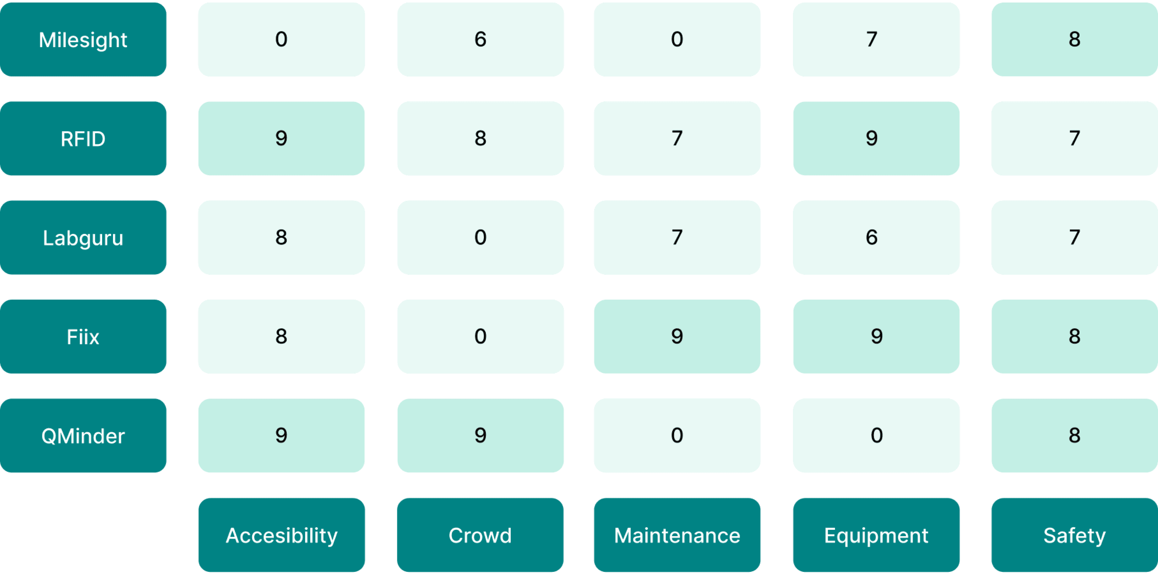 After conducting affinity mapping we came up with a list of requirements on which we rated our competitors on a scale of 0-10 based on how well they performed in that category